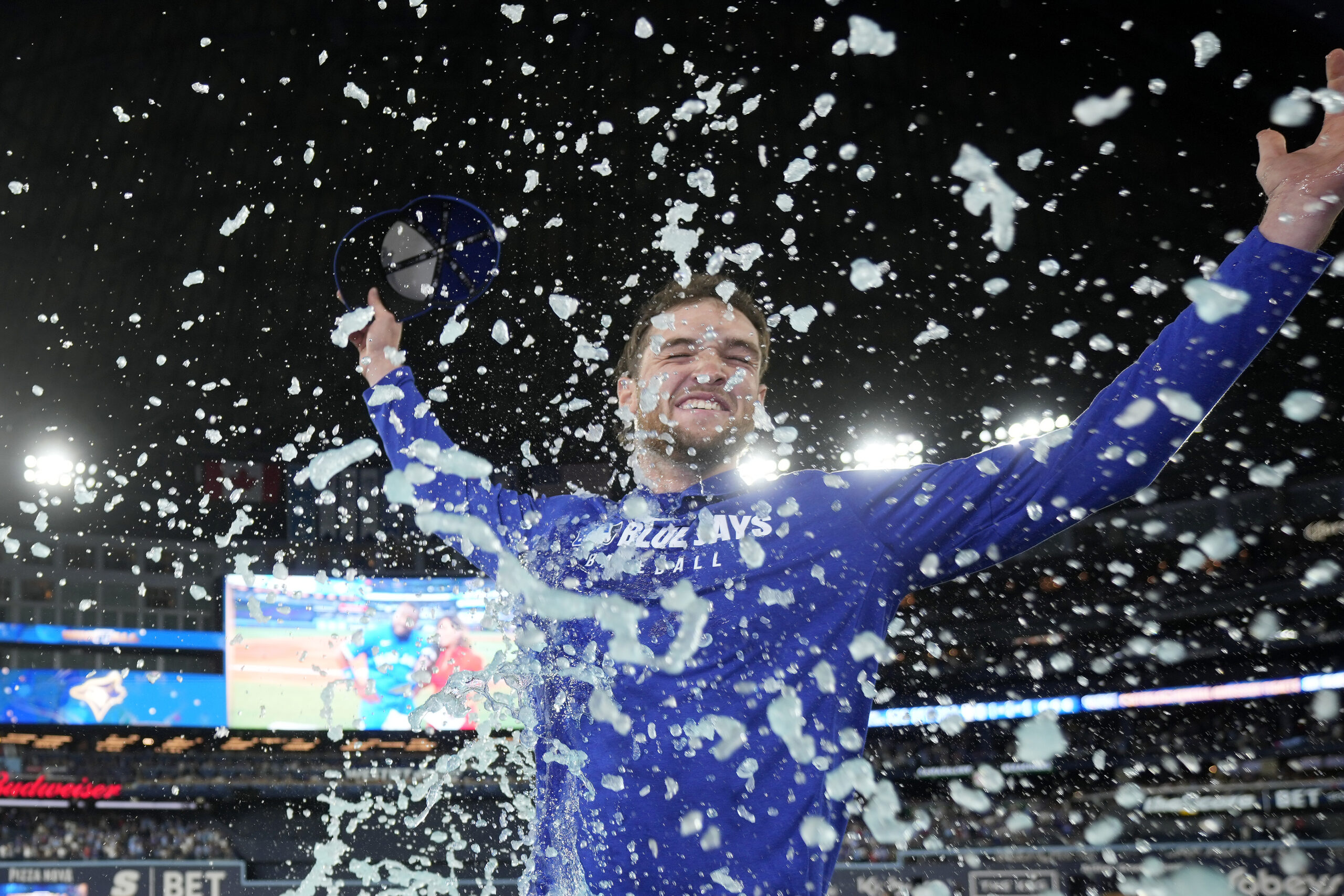 Toronto Blue Jays pitcher Trey Yesavage (39) gets a sports drink shower from teammate Myles Straw after their 13-7 win over the New York Yankees, after MLB American League Division Series baseball action in Toronto, Sunday, Oct. 5, 2025. THE CANADIAN PRESS/Frank Gunn
